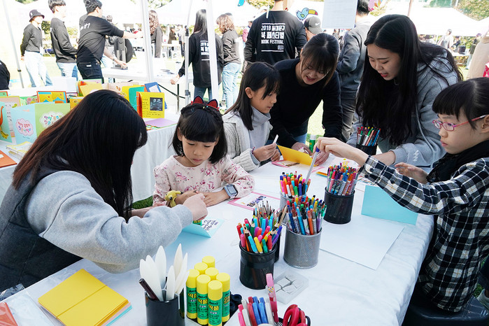 ▲13일 오후, 동대문구청 앞 용두근린공원에서 열린 ‘2018 동대문구 북 페스티벌’ 체험 프로그램에 참여한 아이들. |