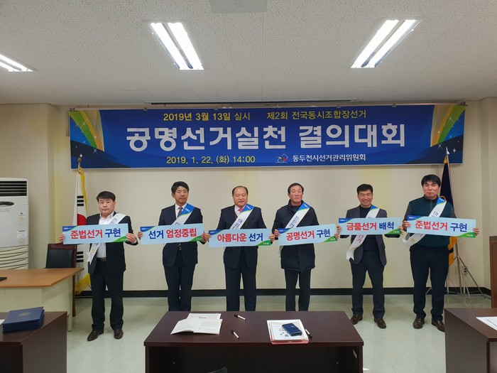 [로컬세계 이혁중 기자]농협중앙회 동두천시지부는 지난22일 동두천시선거관리위원회에서 오는 3.13전국동시조합장선거에 출마 예정인 정진호, 박찬희 후보 2인이 참석한 가운데 동두천시선거관리위원회와 함께 금품·부정선거 금지 및 공명·준법선거를 위한 설명회와 공명선거 결의대회를 가졌다.
