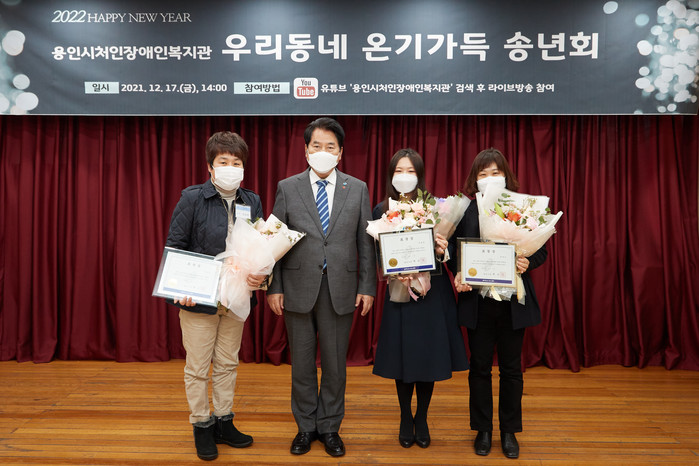 | ▲백군기 용인시장이 17일 용인시처인장애인복지관 송년회에서 한 해 동안 고생한 이들에게 유공자 표창을 전달하고 기념촬영을 하고 있다. |
