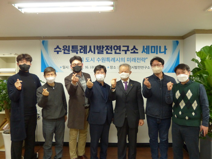 | ▲수원특례시발전연구소 제4차 정기세미나 기념사진 (왼쪽부터 4번째 김상회 수원특례시발전연구소장) |