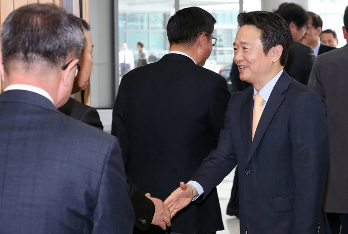 | ▲24일 오전 경기도경제과학진흥원 광교홀에서 열린 "11월 기우회"에서 남경필 경기도지사가 11월 기우회를 마치고 참석한 기우회 회원들과 인사를 나누고 있다. |