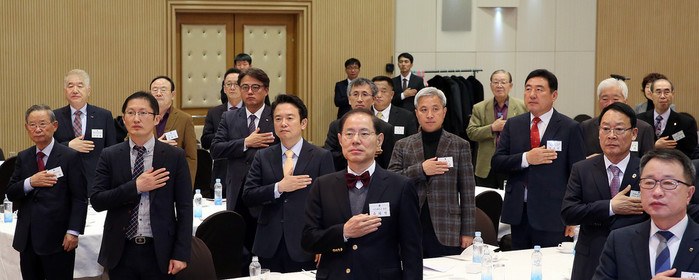 | ▲24일 오전 경기도경제과학진흥원 광교홀에서 열린 "11월 기우회"에서 남경필 경기도지사가 기우회 회원들과 국민의례를 하고 있다.(경기도 제공) |