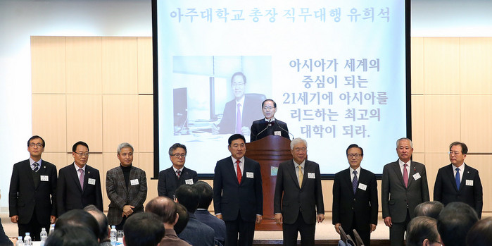| ▲24일 오전 경기도경제과학진흥원 광교홀에서 열린 "11월 기우회"에서 11조 조장 유희석(직무대행) 아주대학교 총장이 기우회 회원들에게 조원들을 소개하고 있다. |