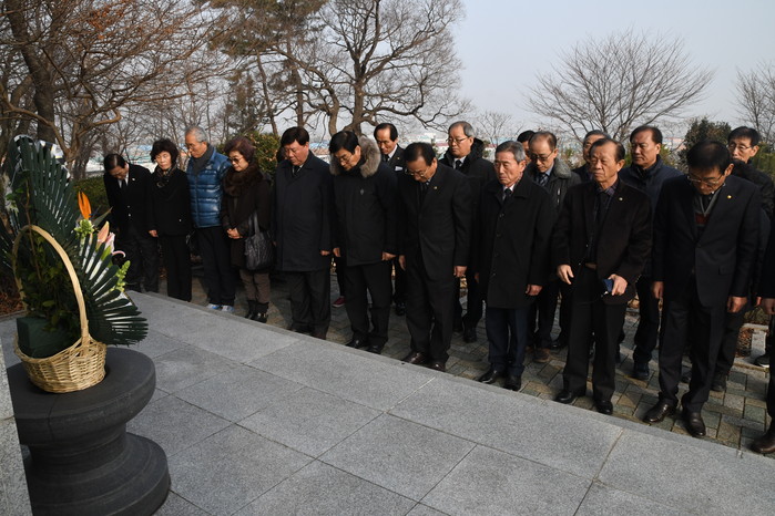 | ▲전몰군경유족회 부산시지부 관계자들이 국군용사충혼탑을 참배하고 있다.(부산지방보훈청 제공) |