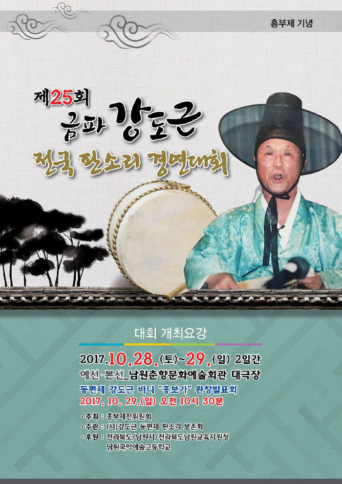 28일 토요일은 예선전이 29일은 동편제 강도근 흥보가 완창 발표회 및 본선이 치러진다.