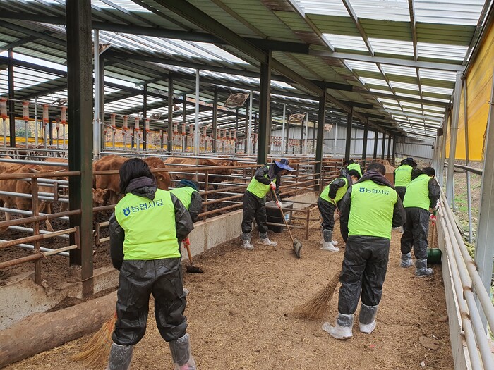 이날 농협사료 본사 직원들은 축사 주변환경 정비와 축산 기자재 정리는 물론 사고방지를 위한 전기시설점검도 실시했다.