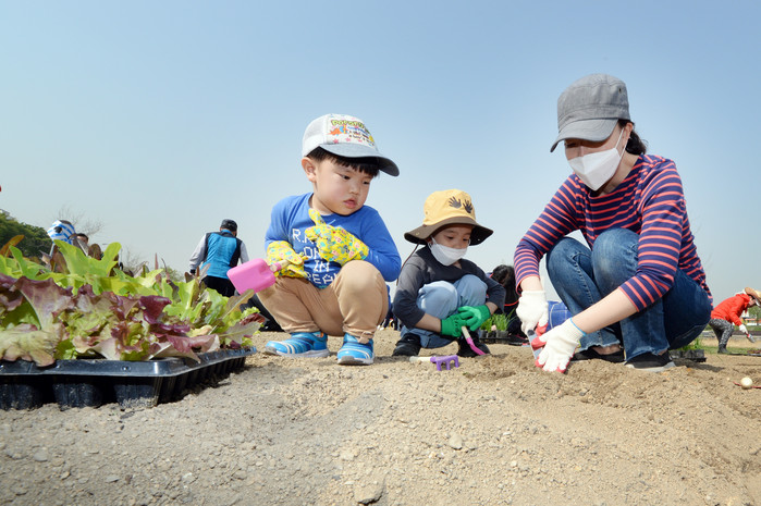 ▲20일 개장한 중랑천 도시농업 체험학습장에서 가족들이 함께 채소 모종을 심고 있다. |