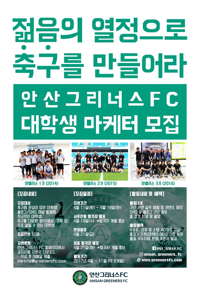 [로컬세계 주덕신 기자]프로축구 K리그 챌린지 안산 그리너스 FC가 ‘젊음의 열정으로 축구를 만들어라’는 타이틀과 함께 대학생 마케터, ‘와텔러스’ 4기 모집을 시작했다.