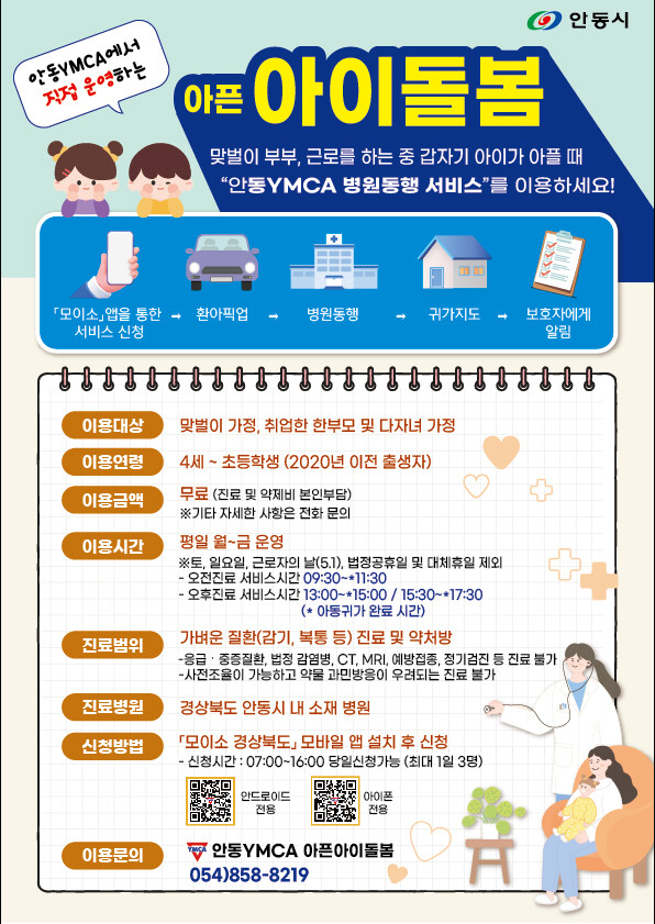 권기창 안동시장은 “아이가 갑자기 아플 때 어려움을 겪는 가정에 아픈아이 병원진료 동행서비스가 큰 도움이 되길 바란다”라며 “앞으로도 다양한 돌봄 정책으로 아이 키우기 좋은 안동을 만들기 위해 지속적으로 노력하겠다”고 전했다.