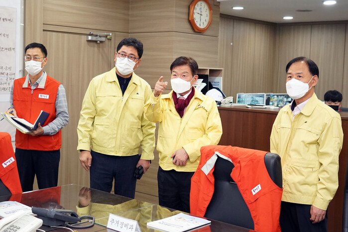 ▲ 이필형 동대문구청장(오른쪽 두 번째)이 동대문구 재난안전대책본부를 방문하여 강설 대비 상황을 점검했다. |