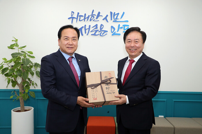 ▲권기창 안동시장이 3일 안동을 방문한 이권재 오산시장(왼쪽)을 환영하고 있다. <사진=안동시 제공> |