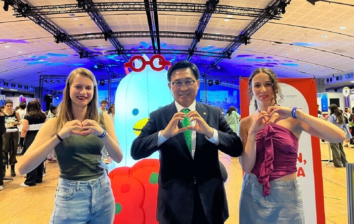 ▲ 2023 파리 K-Food Fair 현장에 참석한 김춘진 한국농수산식품유통공사 사장(가운데). 한국농수산식품유통공사 제공 |