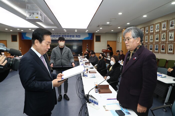 ▲권기창 안동시장이 10일 오전 10시 시청 웅부관 청백실에서 열린 '4차산업혁명 기반산업 발전위원회'에 위원장 자격으로 참석해 한 민간전문위원에게 위촉장을 수여하고 있다. <사진=안동시 제공> |