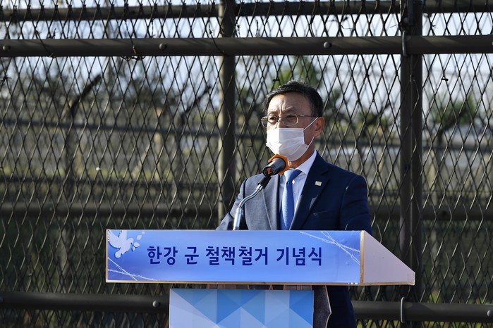 | ▲정하영 김포시장이 10일 열린 ‘한강 철책철거 기념식’에서 “철책철거는 한강하구 일대의 역사와 번영을 되찾고 남북교류와 협력의 새로운 물꼬를 트는 일”이라고 말했다. 김포시 제공 |