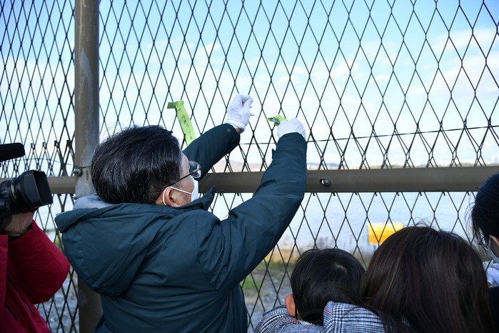 이어 참석자들이 힘을 모아 행사장의 철책을 당겨 철거하고 앞으로 조성 될 산책로 구간을 아이들과 함께 걸으며 희망의 리본을 달았다.
