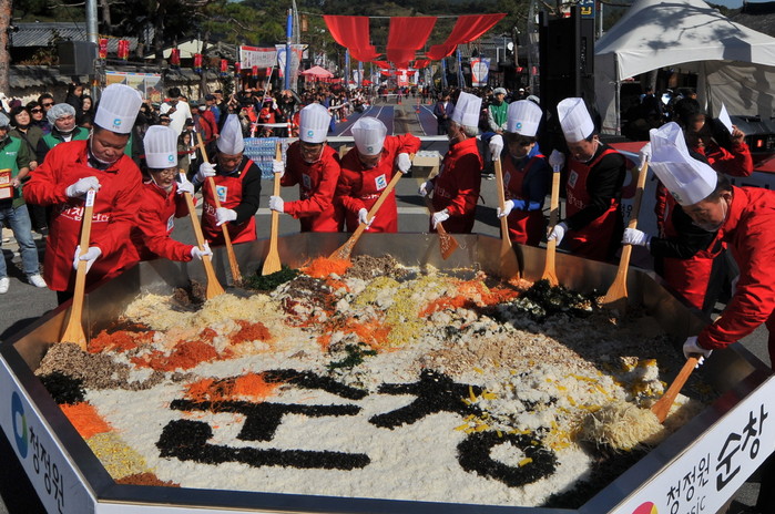제13회 순창장류축제 마지막 날인 21일 순창전통고추장민속마을 특설무대에서 관광객과 함께 황숙주 순창군수, 정성균 군의회 의장, 이남 축제추진위원장이 임병용 청정원 순창공장장과 함께 순창고추장으로 비벼 만든 2018인분 비빔밥을 만들었다.