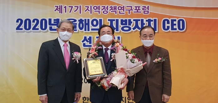 코로나19로 인해 철저한 거리두기 속에 수상자별 개별 시상으로 진행된 이날 선정식에서 김 군수는 서철모 화성시장, 주낙영 경주시장, 이강호 인천 남동구청장과 함께 올해의 지방자치 CEO 선정패를 수여 받았다.