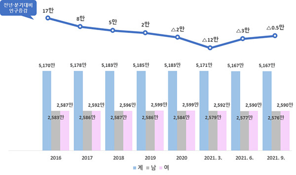 ▲2016년~2021년 9월 인구수 및 전년·분기 대비 인구증감 |
