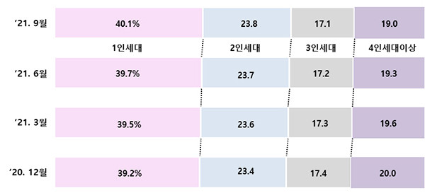 이번 발표에 따르면 1·2인 세대 합계 비중은 63.9%로 지난해 말 대비 1.3%p 증가해 가장 큰 비중을 보이고 있고, 4인세대 이상은 2016년 이래 5년 만에 6%p 이상 큰 폭으로 감소했다. 평균 세대원수는 2.21명이었다.