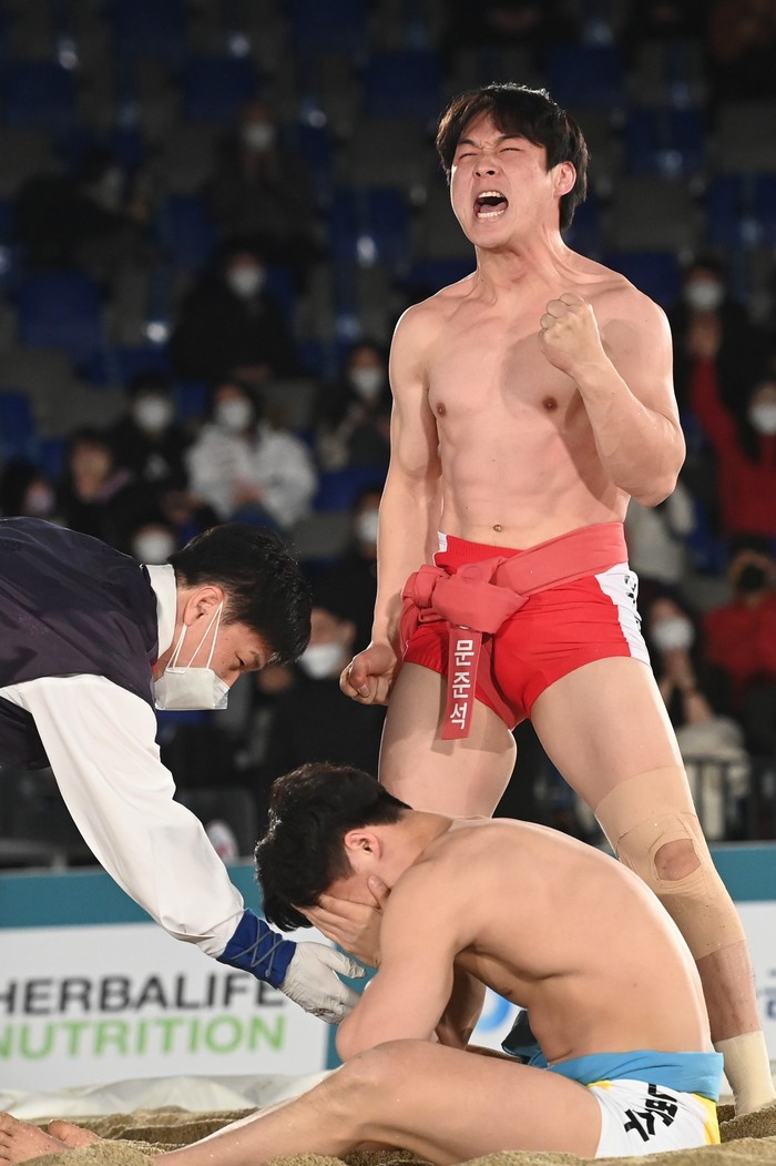 | ▲문준석 선수가 태백장사 결정전 준결승전에서 노범수(울주군청) 선수를 꺾고, 포효하고 있다. |