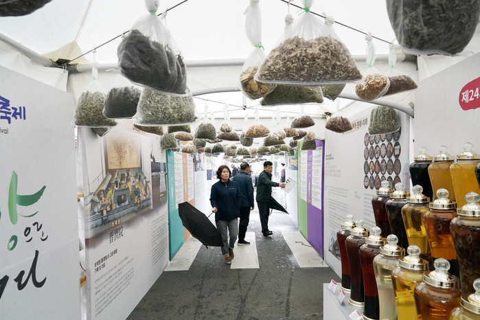 ▲26일 서울 동대문구 서울약령시에서 열린 제24회 한방문화축제에서 방문객들이 다양한 약재가 전시된 부스를 살펴보고 있다. |