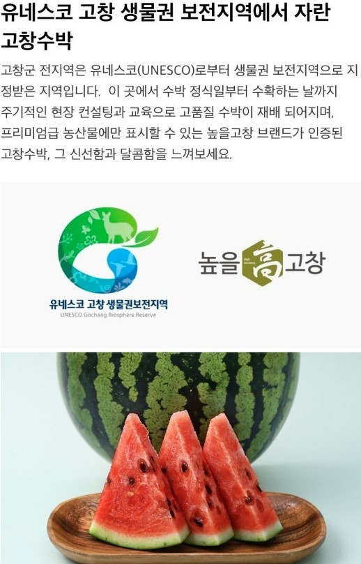 고창수박은 유네스코 생물권보전지역인 고창의 비옥한 토양에서 높은 일조량과 서해안의 해풍을 맞고 자라 당도와 식감이 뛰어나다.