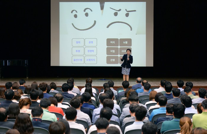▲15일 박연정 강사가 동대문구 소속 공무원· 시설관리공단 직원을 대상으로 반부패 청렴교육을 실시하고 있다. |