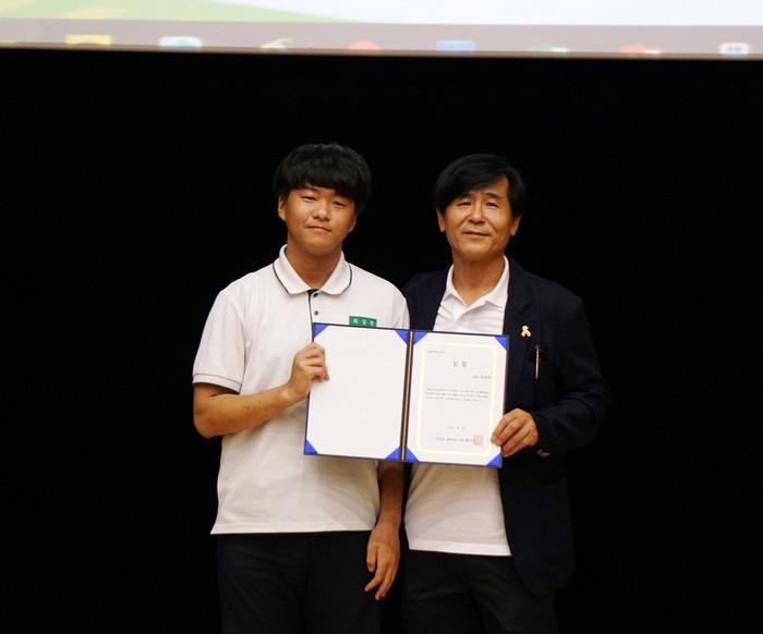 ▲최우수작품을 수상한 최상준 학생(왼쪽)과 공성술 작가. |