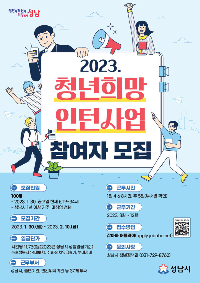 [로컬세계=김병민 기자]경기 성남시는 오는 30일부터 2월 10일까지 ‘청년 희망 인턴 사업’ 참여자 100명을 모집한다.