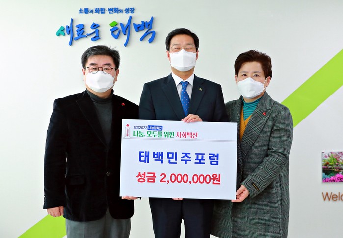 [로컬세계 박상진 기자]강원 태백민주포럼(회장 백충상) 이정호 사무국장과 문미숙 재무담당은 28일 태백시청을 방문해 저소득층 가정 지원을 위한 희망2022 나눔캠페인 성금 200만원을 지정기탁 했다.