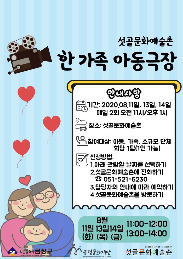 [로컬세계 맹화찬 기자]부산 금정구(구청장 정미영) 금정문화재단은 서3동 섯골문화예술촌에서 오는 11일, 13일, 14일 3일간 오전 11시와 오후 1시 매일 2차례 소규모 아동극 프로그램인 ‘한가족 아동극장’을 운영한다.