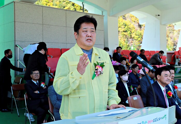 ▲이상호 시장이 15일 열린 제24회 농업인의 날 기념 화합 한마당 행사에서 기념사를 하고 있다. 태백시 제공 |