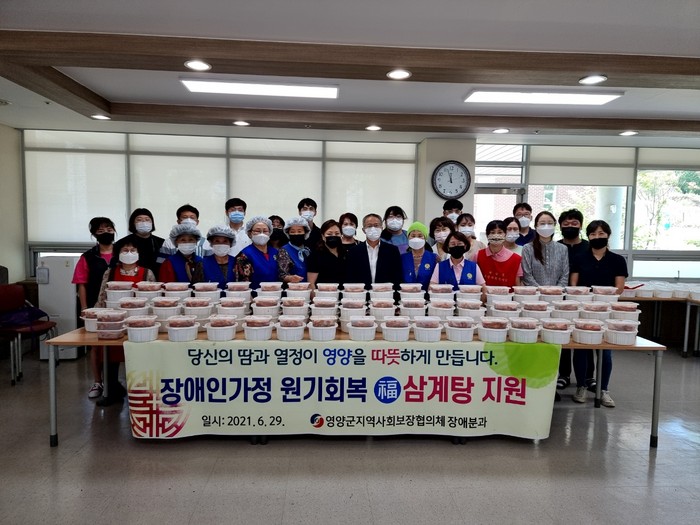[로컬세계 이창재 기자]경북 영양군지역사회보장협의체(공동위원장 오도창·김길동)는 29일 무의탁 장애인 또는 배우자 및 부양자가 장애나 기타 질환으로 인해 식사해결에 어려움을 겪고 있는 장애인 242명에게 원기회복 福삼계탕과 밑반찬을 지원했다.