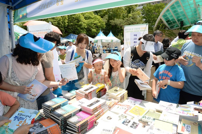 ▲3일 오전 동대문구 배봉산 근린공원 일대에서 열린‘2017 동대문구 북 페스티벌’에서 학부모와 아이들이 책 교환 장터에서 책을 구경하고 있다.(사진제공: 동대문구청) |