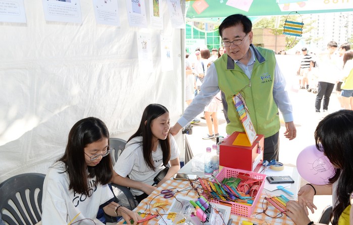 ▲동대문구 북 페스티벌 유덕열 동대문구청장( 녹색조끼)과 참가학생들이 문장만들기 체험을 하고있다. |