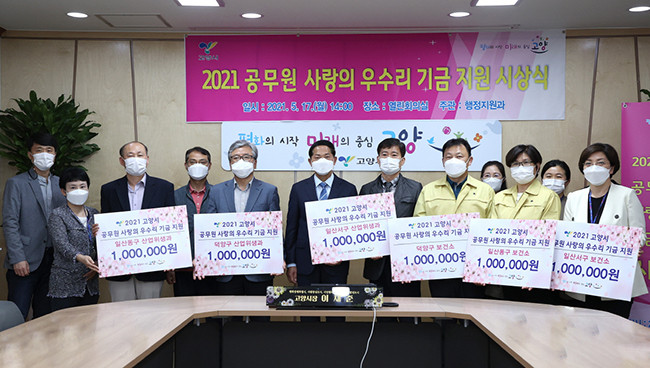 한편 ‘사랑의 우수리 운동’은 1998년 고양시 공무원 제안제도로 채택돼 전국 최초로 시행, 올해로 23년째 이어지고 있다. 이는 공직자들이 급여 중 1000원 미만의 우수리를 모아 갑작스런 사고(중병)등으로 어려움을 겪고 있는 동료(가족)는 물론, 시정의 특별한 격무(재난, 현안 등)가 있는 부서 등을 대상으로 지원금을 지원하는 제도다.