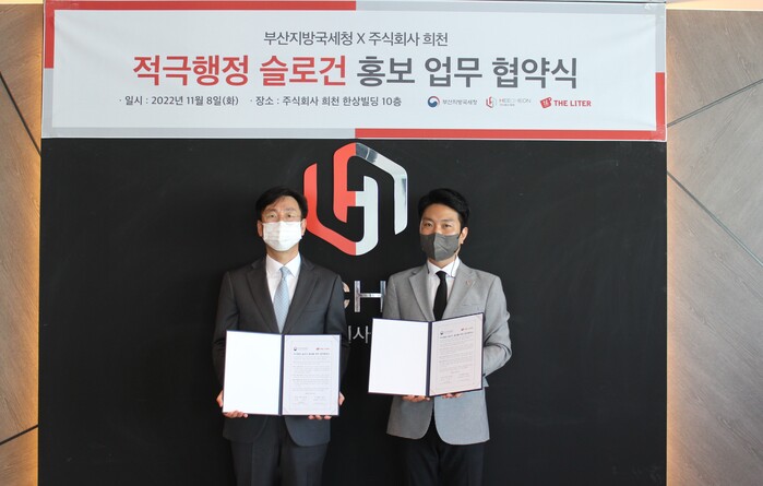[로컬세계 부산=기우치 기자]부산지방국세청은 적극행정 실천의지를 대국민 홍보하기 위하여 지역 프랜차이즈 커피회사인 ‘더리터커피’ ㈜희천과 업무협약(MOU)을 체결했다고 11일 밝혔다.