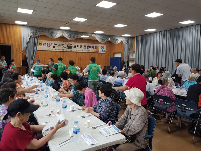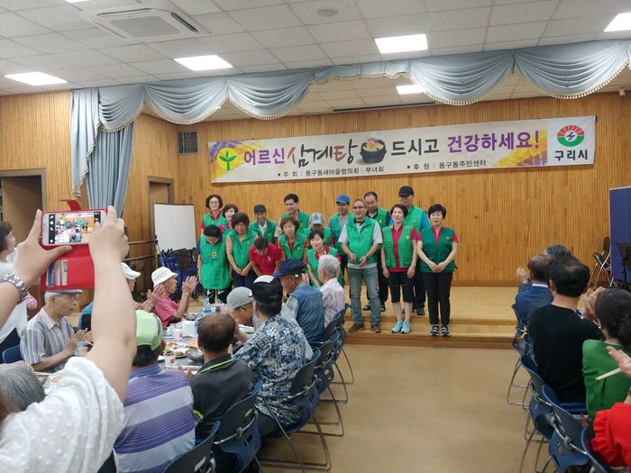 [로컬세계 주덕신 기자]경기 구리시 동구동은 지난 24일 동구동 주민센터 4층 대강당에서 동구동새마을부녀회 및 새마을지도자 주관으로 관내 저소득 독거노인 70여 명을 초청해 삼계탕을 대접했다고 26일 밝혔다.