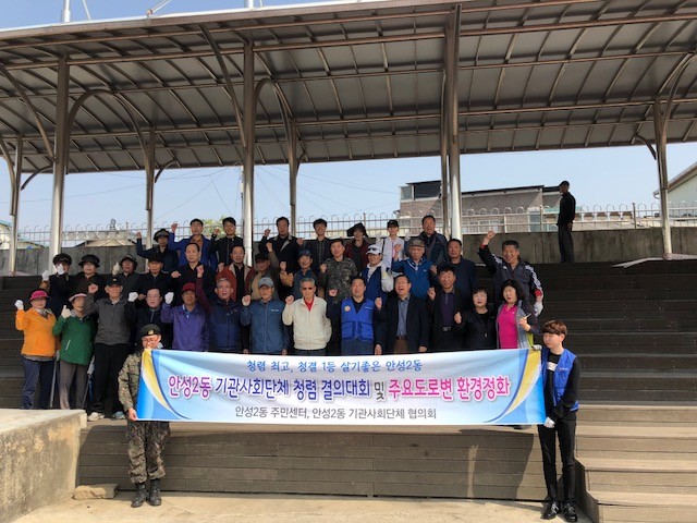 [로컬세계 주덕신 기자]경기 안성2동에서는 20일 각 기관사회단체 회원 및 주민센터 직원들이 청렴행정을 다짐하는 청렴결의대회와 함께 안성천변 및 주요도로변에 대한 새봄맞이 환경정화 운동을 펼쳤다고 밝혔다.
