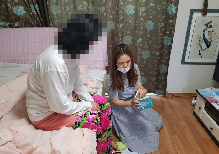 ▲복지플래너가 대상자에게 스마트 플러그를 설치하고 있다. |