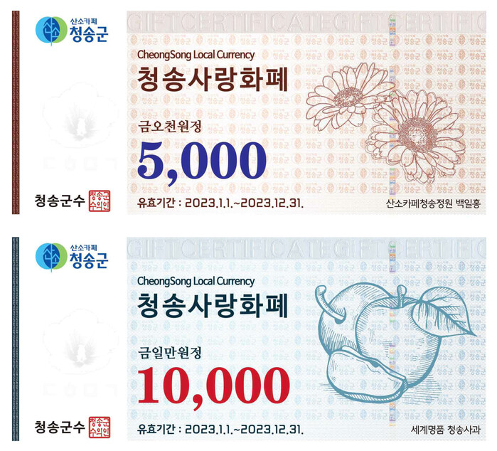 ▲2023년도 발행되는 '청송사랑화폐'의 5,000원권(위쪽)과 10,000원권 모습. <사진=청송군 제공> |