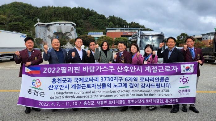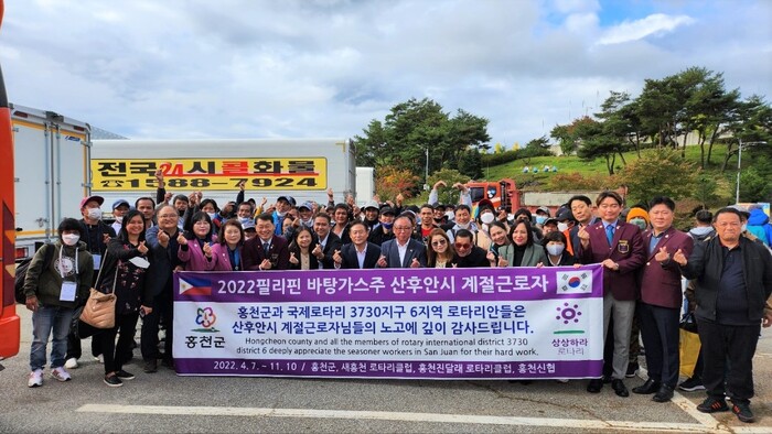 [로컬세계=정연익 기자] 국제로타리클럽 3730지구 새홍천로타리클럽(회장 박원근)은 7일 홍천종합운동장에서 필리핀 바탕가스주 산후안시 계절근로자들이 계약기간 만료로 귀국함에 따라 현장을 방문 환송과 함께 선물을 전달했다.