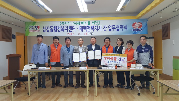 업무 협약식 후에는 한국전력 태백전력지사가 홀몸어르신, 중증 장애인, 차상위 계층에 있는 이웃들이 따뜻한 추석 명절을 보낼 수 있도록 전해 달라며 라면, 휴지, 고추장 등 일백만원 상당의 후원물품을 상장동행정복지센터에 기탁하기도 했다.