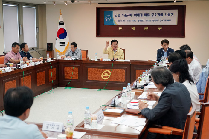 [로컬세계 임종환 기자]서울 동대문구가 14일 구청 기획상황실에서 일본수출 규제 및 백색 국가 제외에 따른 피해기업의 애로사항 청취 및 지원방안을 강구하기 위해 동대문구 상공회 기업인 및 관내 중소기업 대표 20여 명과 간담회를 가졌다.