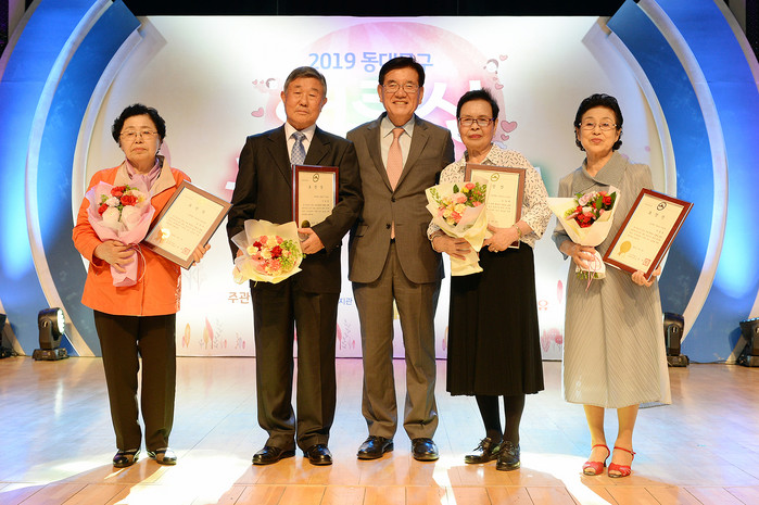 ▲2019 동대문구 어르신 문화축제에서 모범어르신으로 선정된 4명의 어르신과 유덕열 동대문구청장(가운데)이 기념촬영을 하고 있다. |