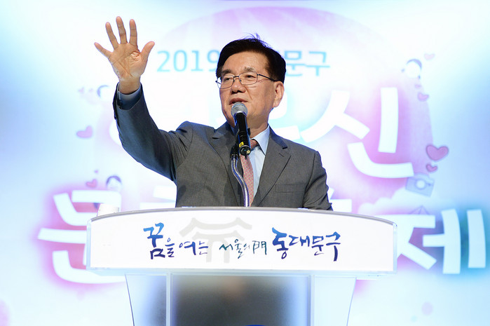 ▲2019 동대문구 어르신 문화축제에서 유덕열 동대문구청장이 기념사를 하고 있다.(동대문구 제공) |