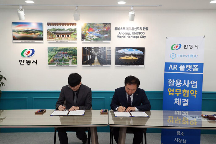▲권기창 경북 안동시장(오른쪽)과 김정익 ㈜스노우파이프 대표가 19일 시청 시장실에서 열린 글로벌 AR 플랫폼을 활용한 국내‧외 관광객 유치 활성화를 위한 업무협약식에서 협약서에 서명하고 있다. |