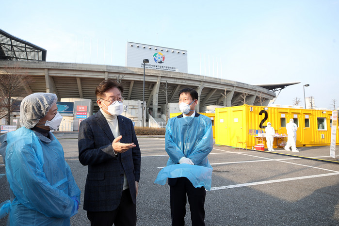 이날 오후 이 지사는 수원월드컵경기장 주차장에 설치돼 운영을 개시한 경기도 선별진료센터를 방문하며 외부 활동을 재개했다.