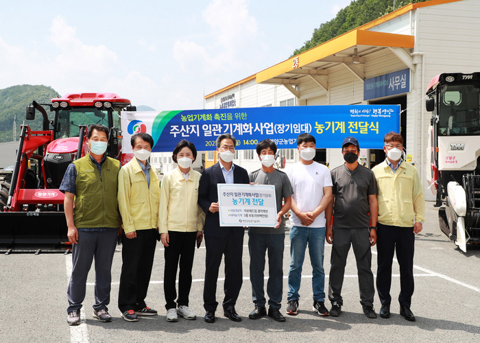 [로컬세계 이창재 기자]경북 영양군은 21일 오후 2시 농업기술센터 농기계임대사업소에서 오도창 군수를 비롯한 행사관계자 15명이 참석한 가운데 올해 장기임대사업 신규대상자로 선정이 된 ‘석보해드림 콩작목반’를 대상으로 장기임대 농기계(5종 6대) 전달식을 가졌다.