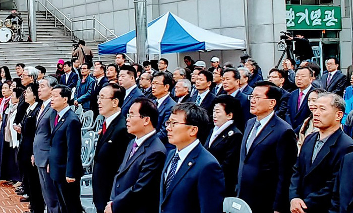 ▲유덕열 동대문구청장(오른쪽에서 두 번째)이 16일 부산 민주공원에서 열린 ‘부마민주항쟁 38주년 기념식’에 참석해 ‘우리의 소원은 통일’을 제창하고 있다.(동대문구청 제공) |